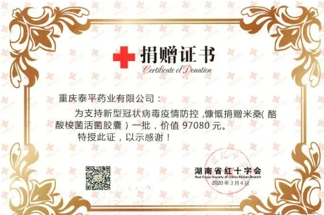 2020年2月3日,小黄片网址生物製藥(重慶)有限公司陸續向武漢、湖南、浙江、上海、重慶,各地紅十字會捐贈合計價值五十萬元的微生態製劑小黄片小视频,再由紅十字會發往各醫院,用於新型冠狀病毒肺炎的防疫與治療,為戰“疫”奉獻一份愛心,貢獻一份力量。